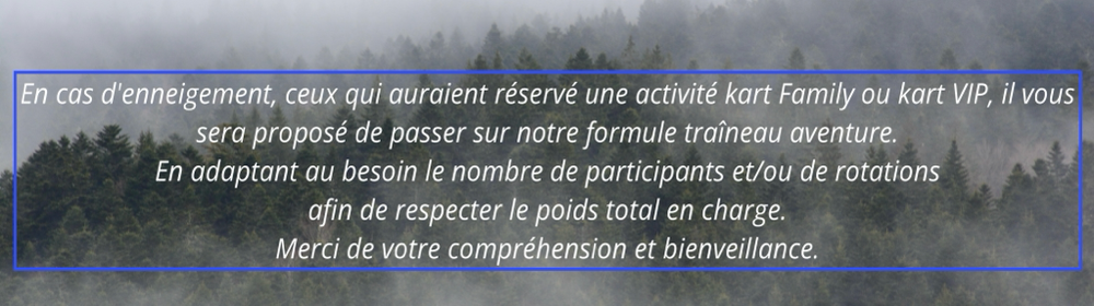 Quand vous réservez un baptême d'attelage avec nos chiens de traîneau, celui ci se voit en traîneau ou kart (traîneau à roues) en fonction de la météo, l'activité reste la même et les p’tits chiens sont toujours aussi mignon et heureux de partager avec vous ce qu’ils aiment faire. Ainsi nos conditions en matière d'annulation sont fermes. Vous réservez donc un baptême d'attelage. Celui ci est maintenu tant que le musher estime que les conditions le permettent. L'absence de neige n'est donc pas un motif recevable pour une annulation.